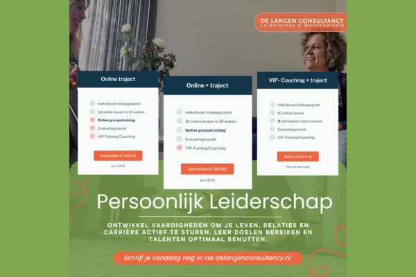 Om jouw groei te ondersteunen, kun je naast individuele coaching ook kiezen voor onze exclusieve training Persoonlijk Leiderschap voor Leiders, geheel op maat ontwikkeld voor leiders en vernieuwd met een quiz om jouw resultaten te meten. Daarnaast ontvang je in overleg tussentijdse opdrachten die aansluiten bij jouw persoonlijke en professionele vraagstukken. Door te leren, reflecteren ontwikkel jij jezelf als leider, zodat jij jouw beoogde doelen gaat behalen. Dit kan een bedrijfsdoel zijn, maar ook een persoonlijk doel, alles is mogelijk!